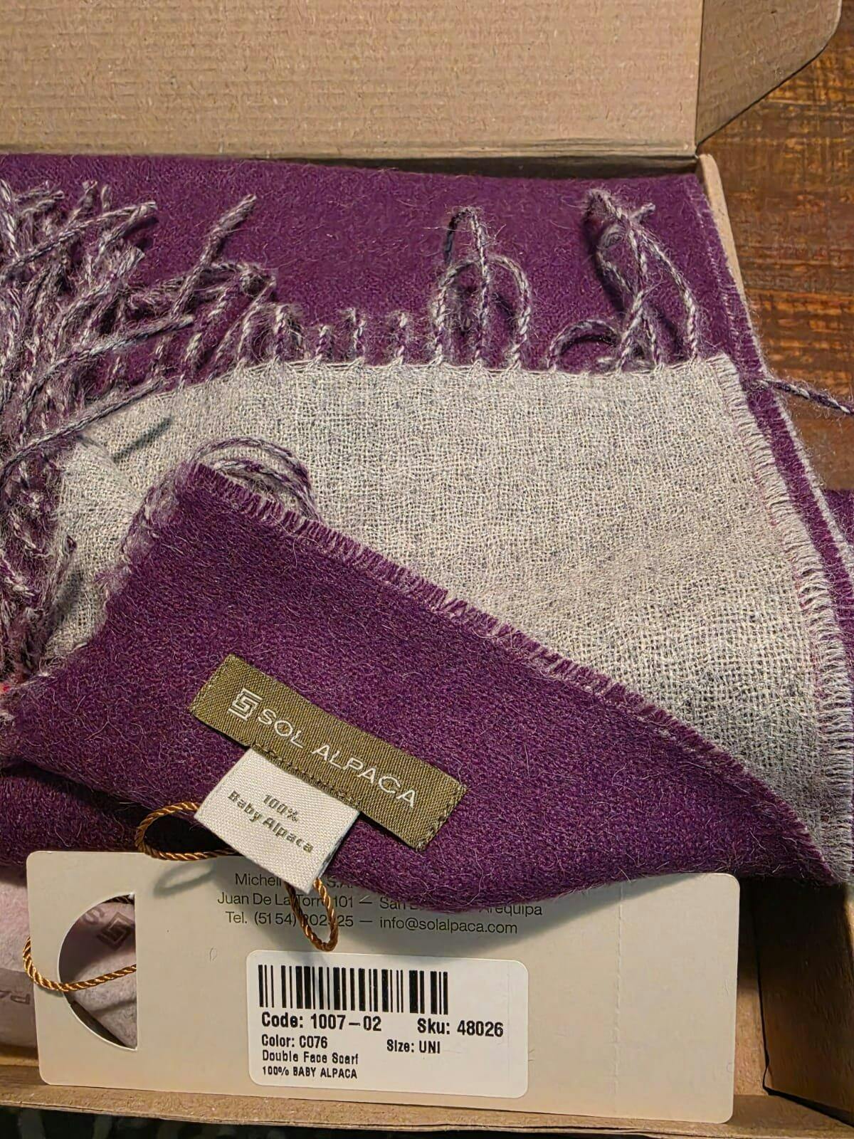 Scarf crafted in 100% Baby Alpaca, featuring a double-faced finish that combines two shades in one piece. Its refined design with fine fringes provides versatility and elegance, allowing for multiple styling options. Light, soft, and warm, it is the perfect accessory to enhance any outfit in chilly weather.